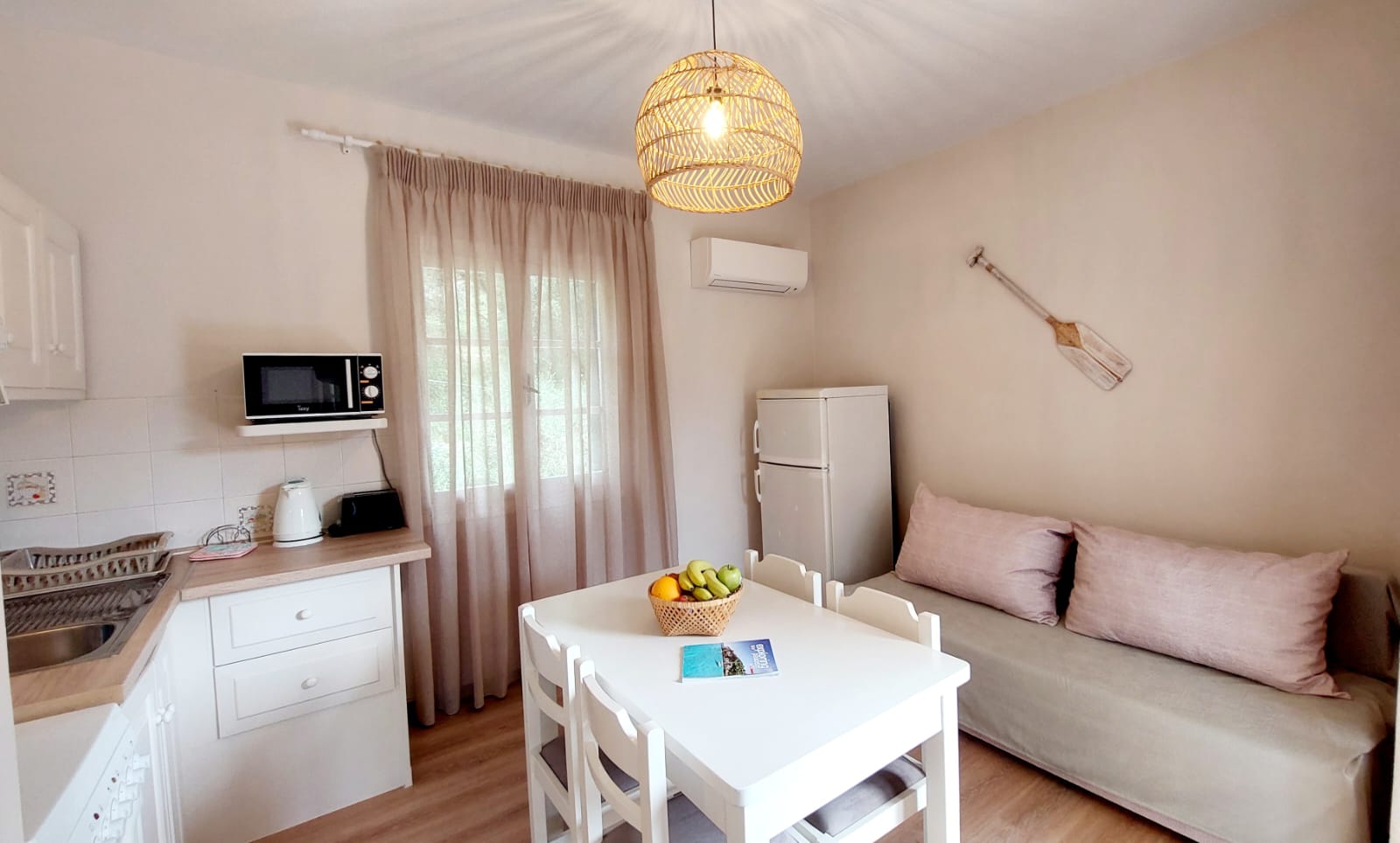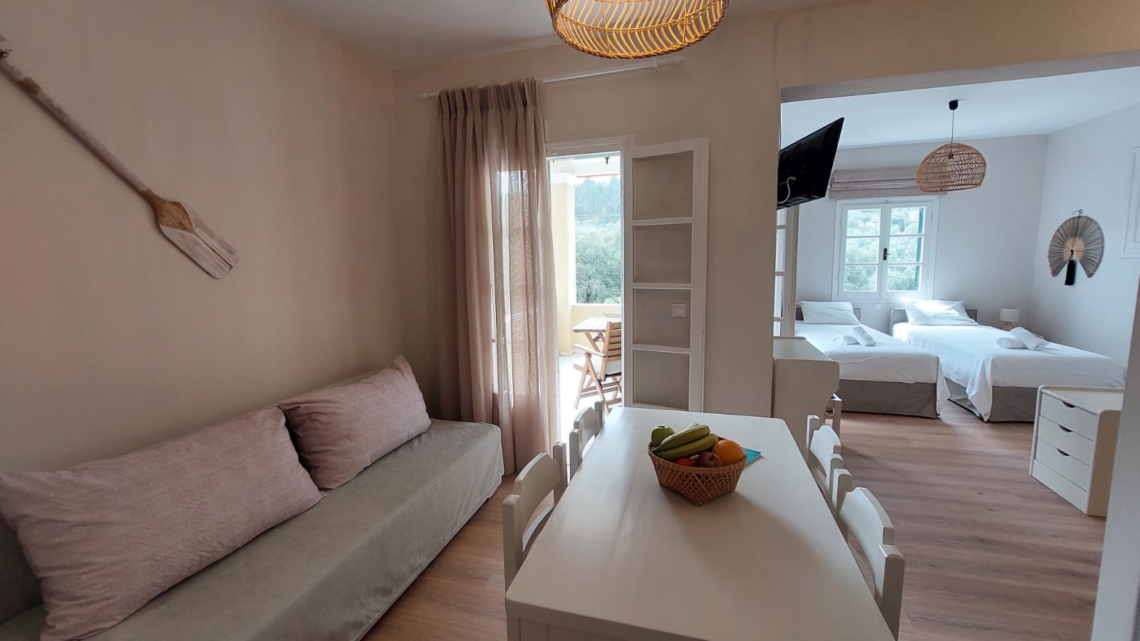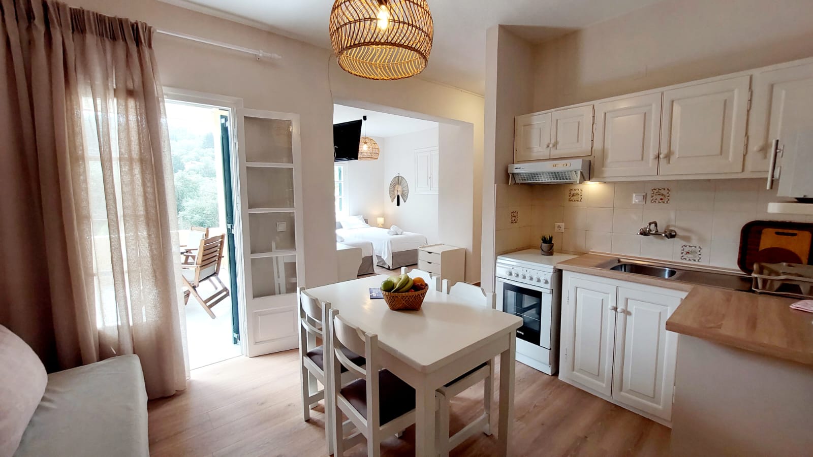 The Studios consist of separate bedroom with either twin or double beds, fully equipped kitchenette / dining area, a bathroom with hot shower and a large private veranda which overlooks the fantastic gardens that are maintained by the owner Yannis Grammatikos.