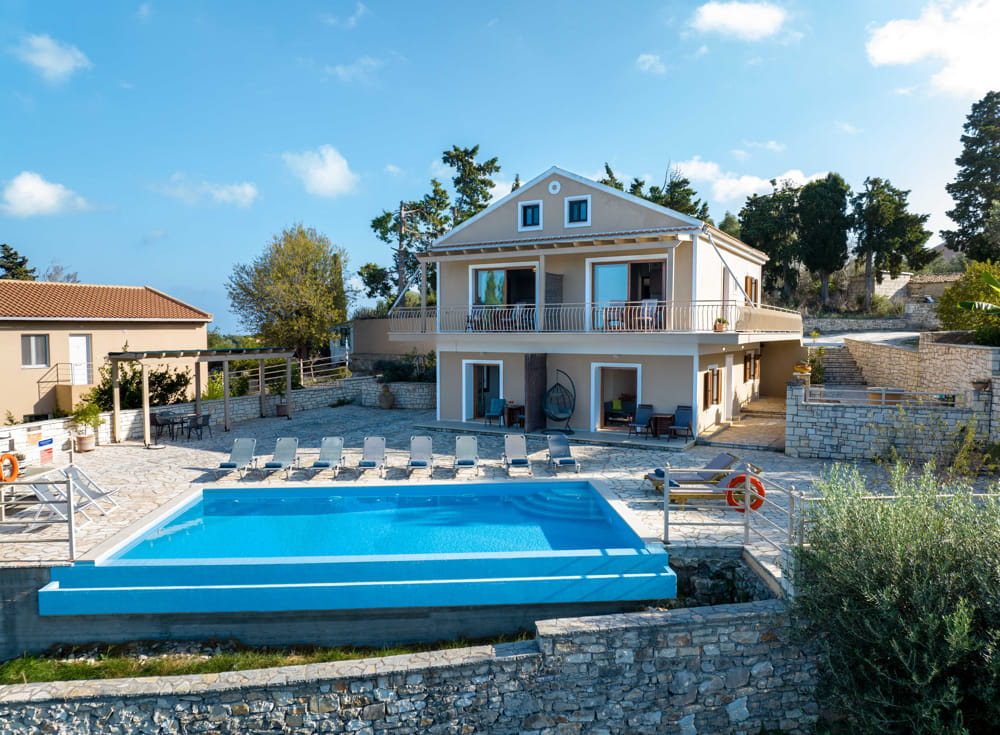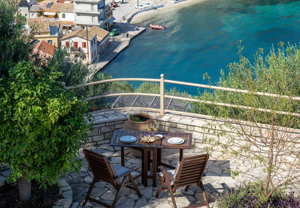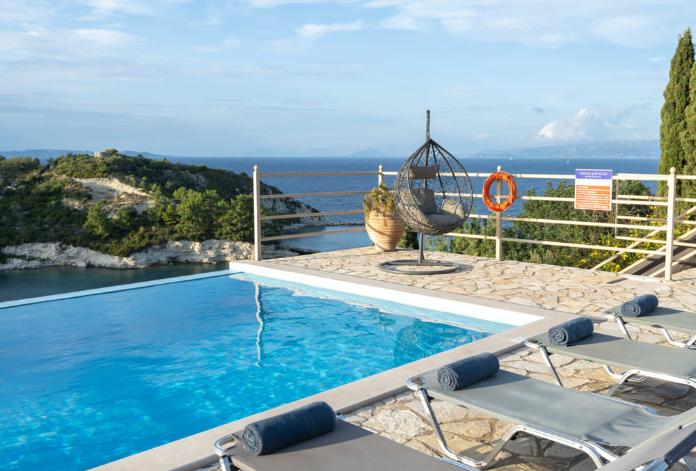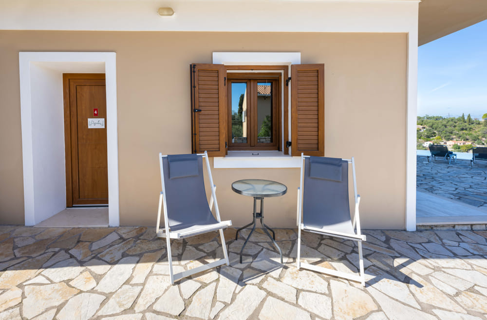 Independent apartment on the ground floor next to the pool with a view of the sea and the port of Loggos.