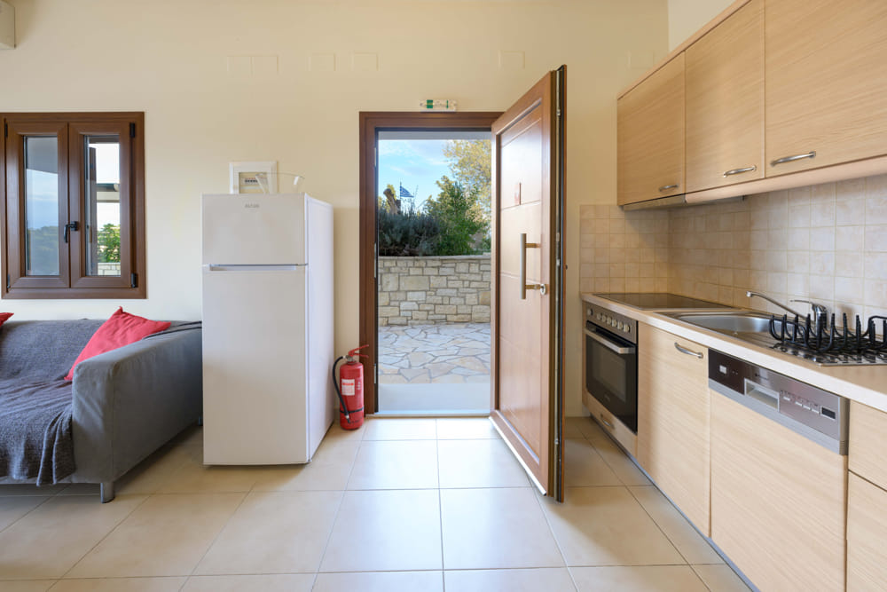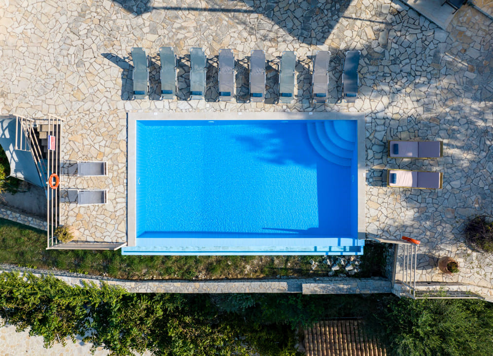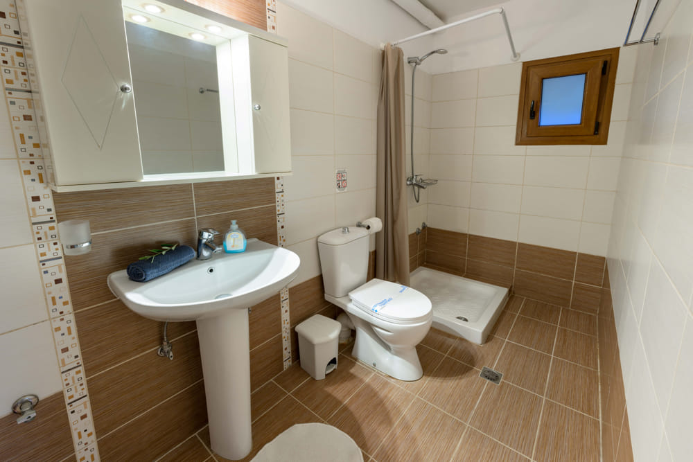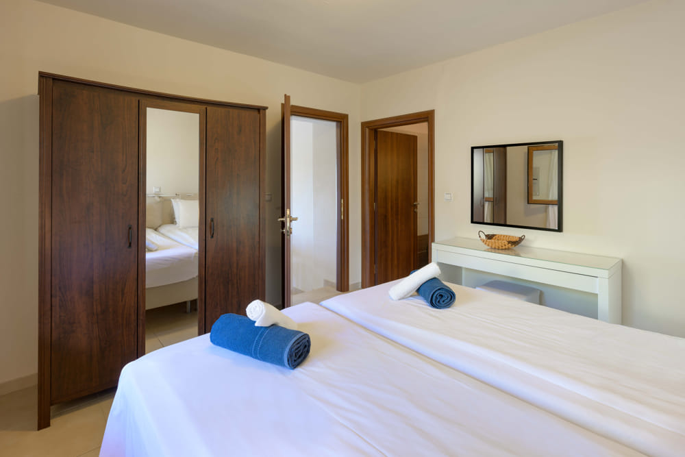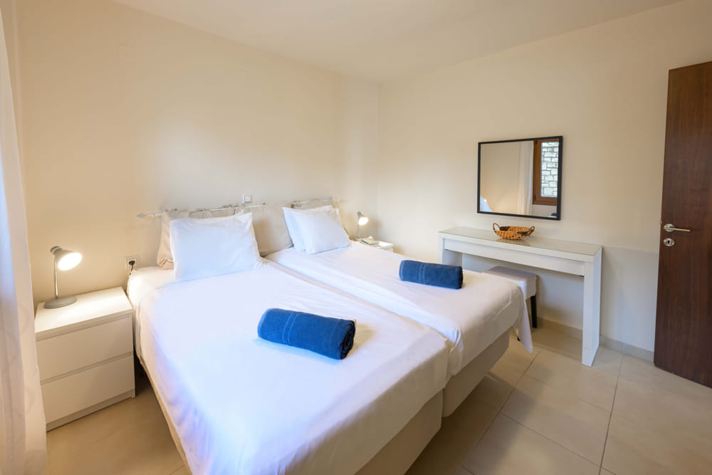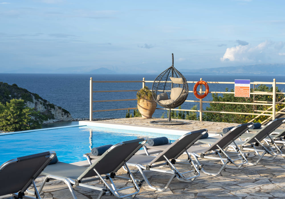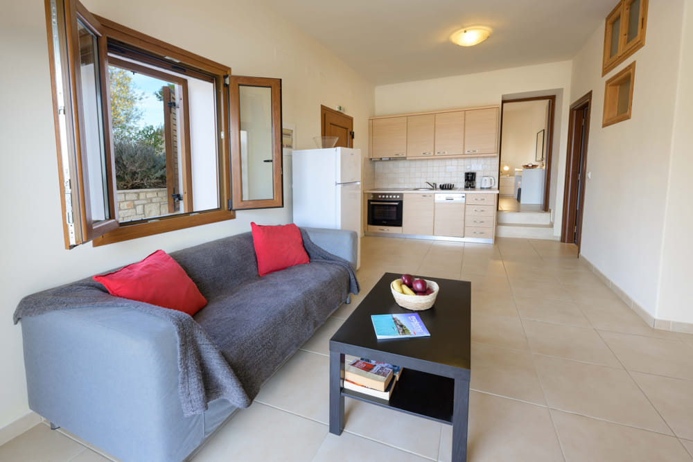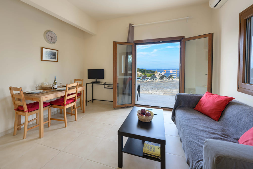 Poseidon has 1 double bedroom, kitchen, living room, bathroom with shower and private balcony. Outdoor large terrace with sunbeds, umbrellas and swimming pool shared with 3 other apartments.