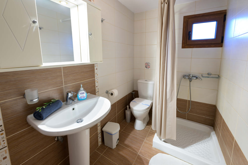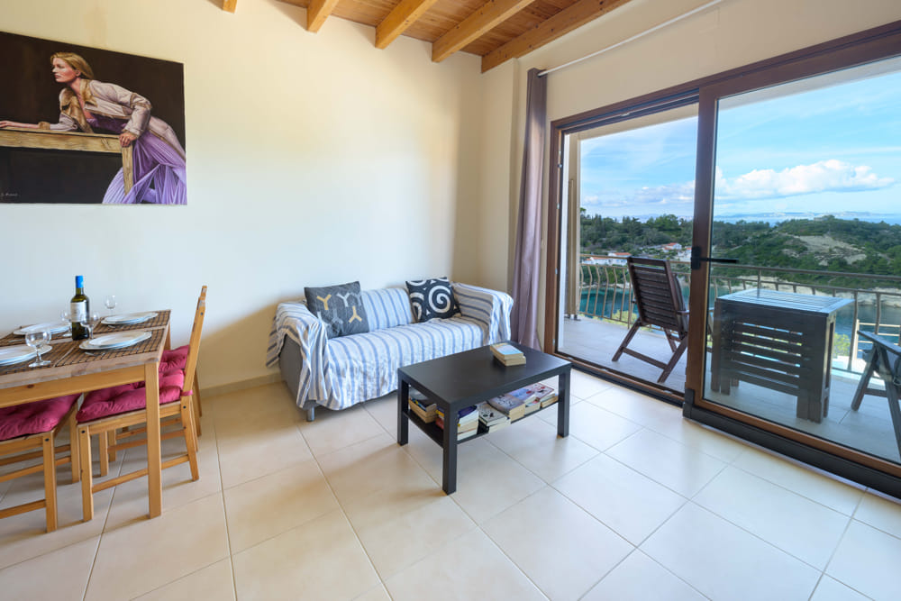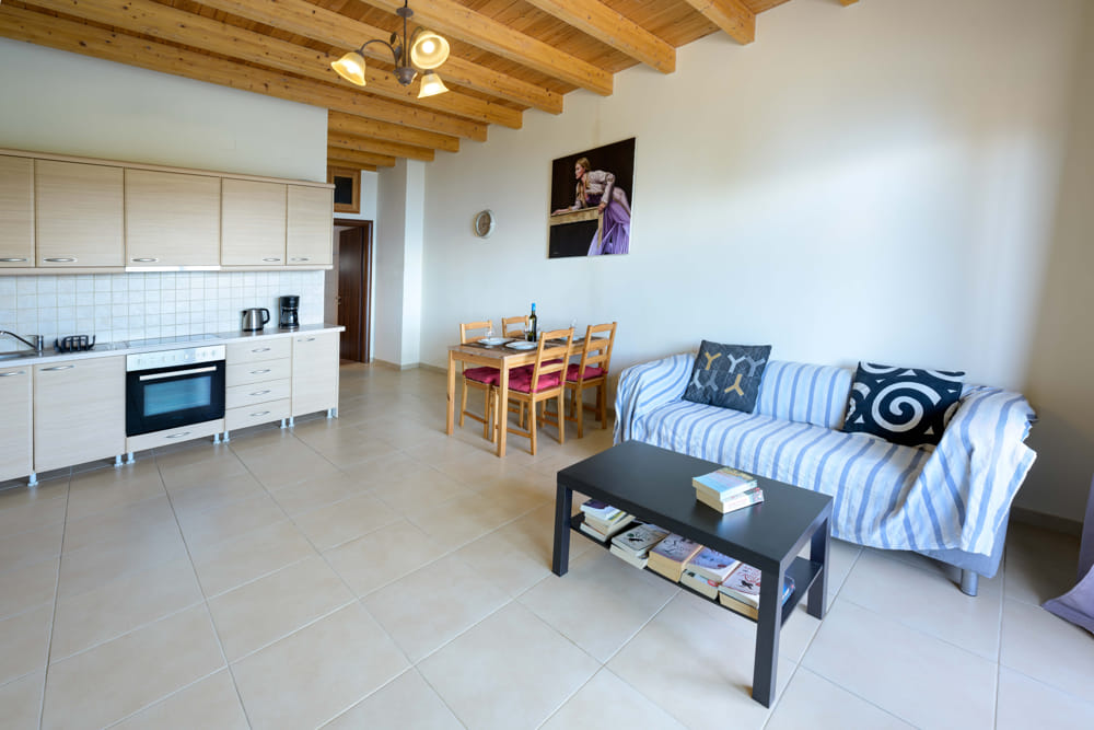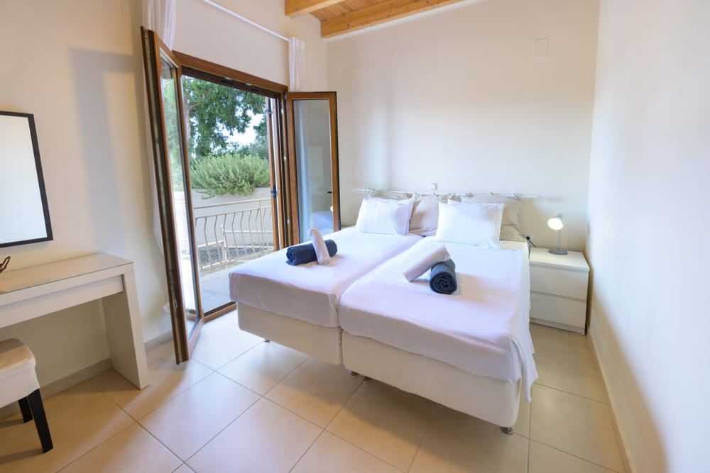 Zeus has 1 double bedroom, kitchen, living room, bathroom with shower and private balcony. Outdoor large terrace with sunbeds, umbrellas and  swimming pool shared with 3 other apartments.